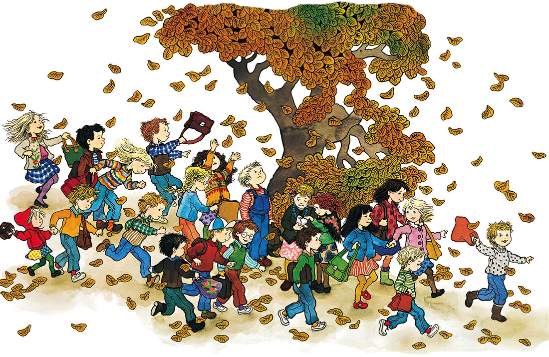 Și, ce să vezi, într-o zi, Peter îi spune Lenei: „Hai, vino cu mine ca să vezi cum e la școală.“ Și cum e? Învățătoarea este prietenoasă, să socotești la tablă sau să citești nu pare așa greu, în pauza de masă copiii primesc clătite (bine că Lena nu a nimerit în ziua în care la cantină se servește pește), iar în recreație, Lena se joacă alături de Peter și colegii săi în curtea plină de frunzele ruginii ale toamnei.